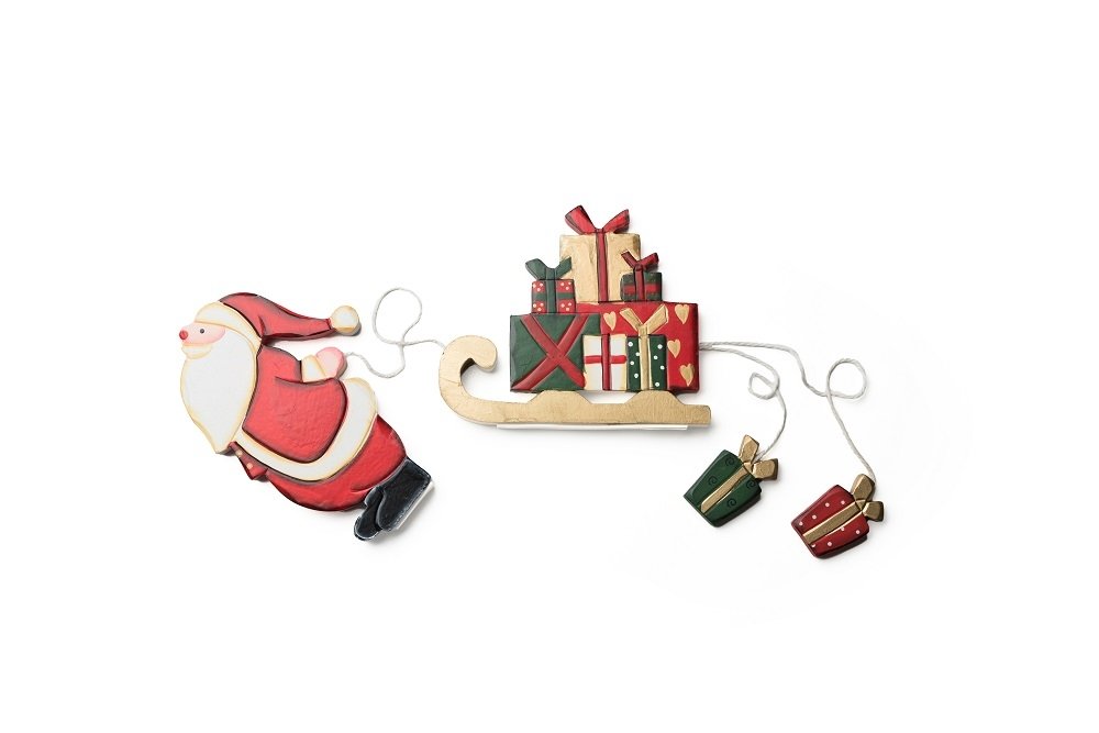 Drevená (dvojrozmerná) figúrka Santu so sánkami a darčekmi.